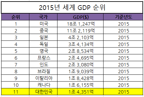 말 그대로 인구빨인 중국 인도 브라질은 걸러라. 그럼 소위 헬무새들이 뭔나게 빨아대는 G7이다.
