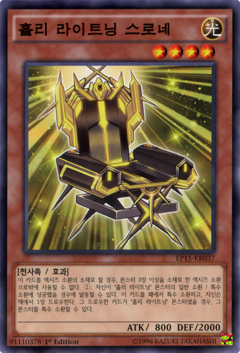 이 카드가 특수 소환되는 순간 패에서 홀리 라이트닝 몬스터를 1장 더 특수 소환하며, 그 뒤에 묘지의 빛 속성 몬스터 1장을 덱 맨 위에 놓는 효과를 가지고 있다.