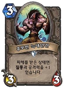 3코 3/3, 이 하수인은 피해를 받은 상태면 질풍과 공격력 +1을 얻습니다.