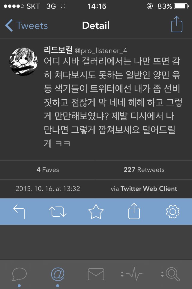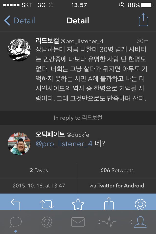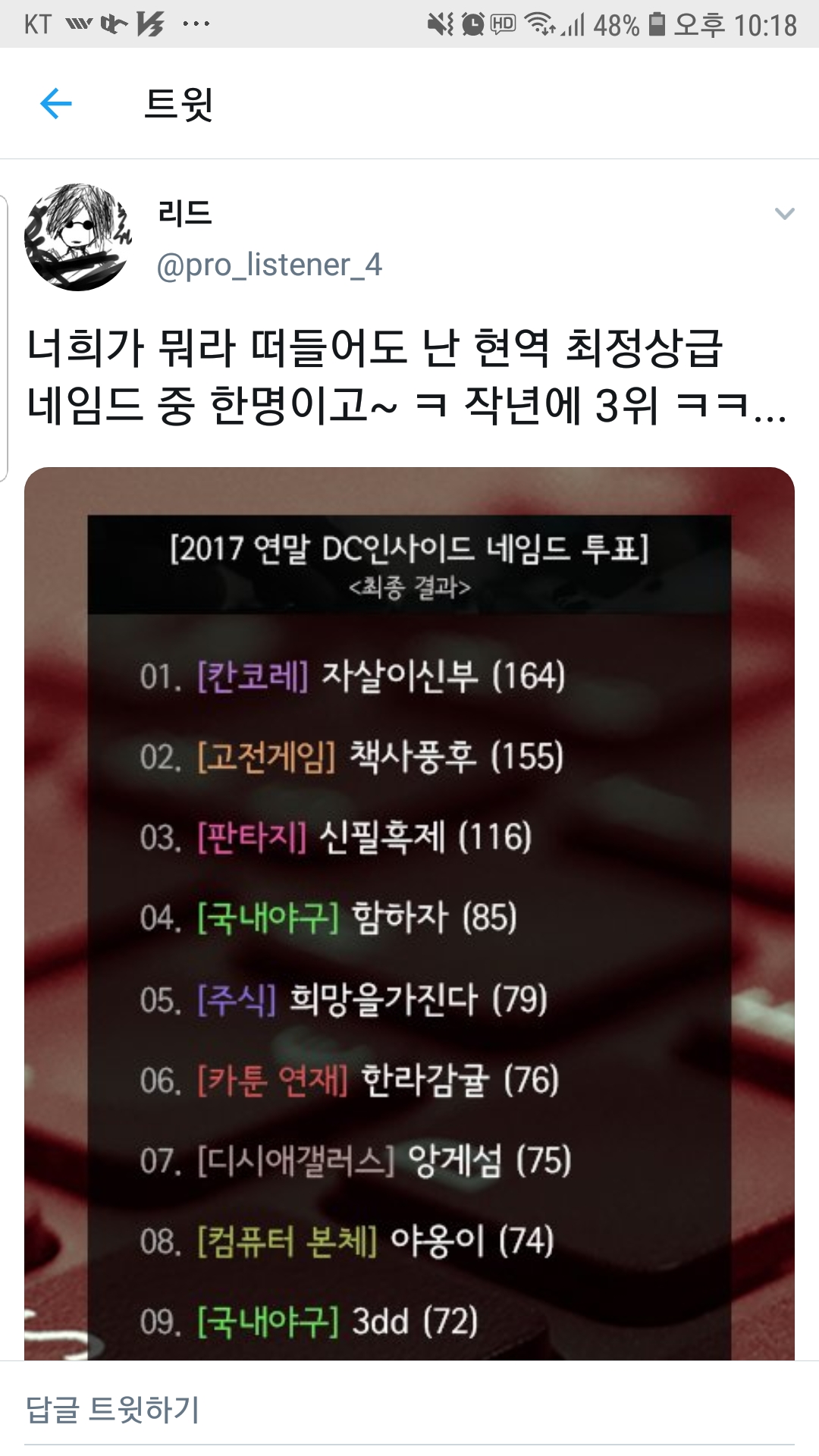 그리고 최근 트위터 계정만들어서 헛소리 싸지르는중이다. 자기 스스로 오랫동안 활동해온 네임드임이 자랑스럽다느니, 철구나 신태일은 10년뒤에 잊혀져도 자긴 잊혀지지 않을거라느니 등등. 닉네임은 리드(@Pro_listener_4).