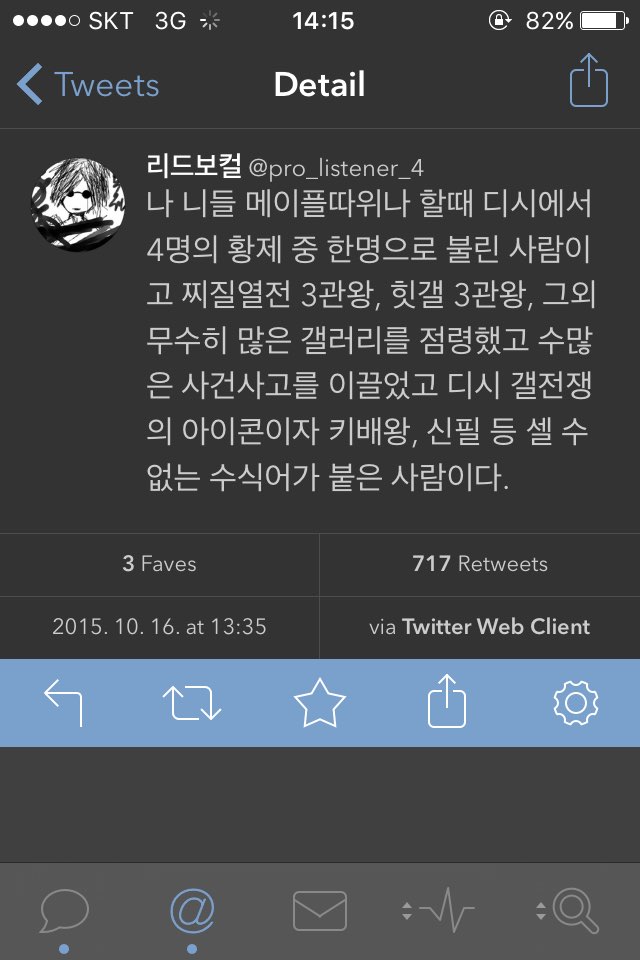 인생 최고 업적이 애미 등골 빨면서 디씨 네임드된거인 엠생새끼들이야 널렸다만 그걸로 나이 30 쳐먹도록 저 정도 수준의 자부심을 뽐내는건 건 흑제가 유일하지 않을까 싶다.