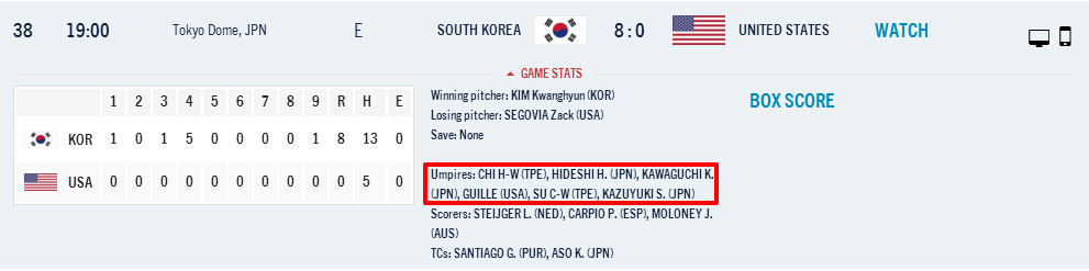 - 개최국 버프 + 오타니 버프로 잔뜩 무장한 일본은 08 베이징을 잊지 못하던 한국에게 참교육을 시켜주며 시작했고 나머지 4경기도 압도적으로 가지고 놀면서 8강에 무난히 진출했다. 미국전에선 일본인 심판을 1루심으로 배치하는 개최국 깡패짓을 해서 이긴게 함정. 그리고 그들은 4강에서 한국을 만나 대첩을 찍고 나가리.