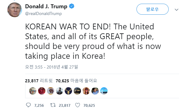 종전 해도 한동안 그렇게 크게는 안 바뀔 거다. 정전을 끝낸다 뭐다 지랄 발광해도 북괴놈들 바뀐 거 있었나? 좋은 방향이건 나쁜 방향이건 김정은이 뇌종양 걸려서 남침하지 않는 이상 바로 바뀌긴 힘들다. 옛날 개혁 개방 이전 중공과 비슷한 관계만 되어도 좋겠다만 뭐 잘해봐야 평양 관광, 개성 공단, 금강산 관광 정도만 가능할 듯. ㄹㅇ 다 열고 놀러오라고 하면 북괴 난리 날 테고.