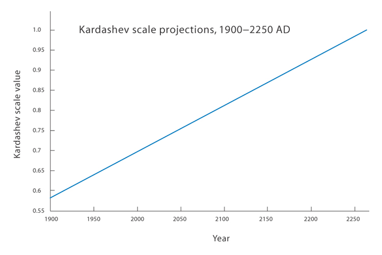 0.73단계다. 2030년대 쯤 되면 0.75단계에 도달한다. 21세기 말 2090년대 쯤 되면 0.85단계다. 다만 기술적 특이점이라는 변수 때문에 이 그래프가 어느순간 수직으로 치솟아 오를 수도 있으니 주의하자.