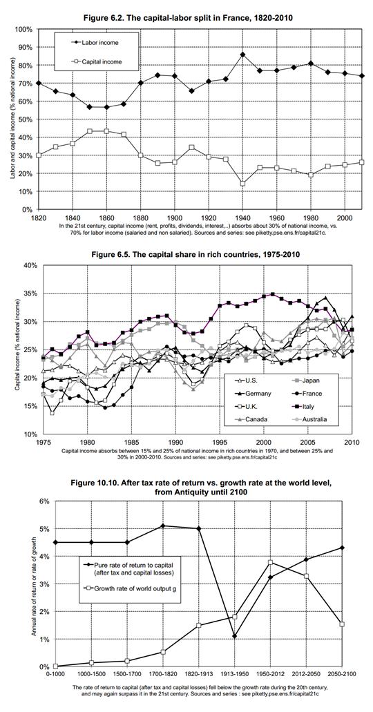 19세기 초의 모든 사회에서 대략 4~5%였던 순수한 자본수익률은 오늘날 3~4%로 하락했다.[25] 1913~1950년에는 세계대전등 여러가지 상황으로 세후 자본수익률 한때 1%까지 낮아지기도 했지만 이는 아주 예외적인 상황이었다.