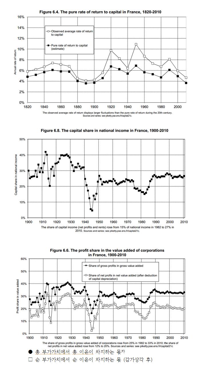 자본소득 구성별로 보면 1990~2010년 프랑스에서 이윤이 차지하는 몫이 안정적임에도 불구하고 자본의 몫이 전체적으로 상승한 것은 1945년부터 임대료가 국민소득에서 차지하는 몫이 꾸준히 증가했기 때문이었다.