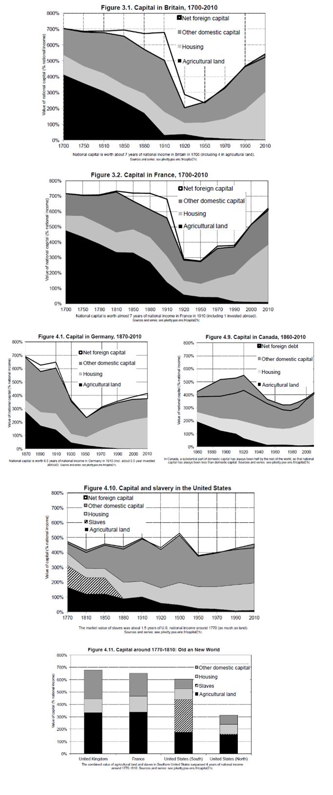 미국은 유럽보다는 전쟁의 충격을 훨씬 덜 받았기 때문에 미국의 자본/소득 비율을 훨씬 더 안정된 수준으로 유지할 수 있었다. 1913년 당시 미국은 해외자산 보유보다는 영국인에 의해 소유되고 있는 것이 더 많았다. 미국은 땅이 넓고 토지의 가격이 상대적으로 아주 낮아 유럽보다는 농경지의 부가 덜했다. 대신 노예가 유럽보다 부에서 훨씬 많은 부분을 차지했다.[14] 미국 노예의 수는 노예제도의 폐지로 사라지기 전인 1865년에 400만명을 넘어섰다.[15] 미국을 남부는 인구의 절반이 인구의 다른 절반을 소유해 소유권의 불평등이 가장 극단적이었다. 죽창.. 주욱창...
