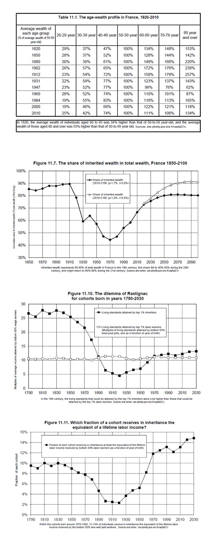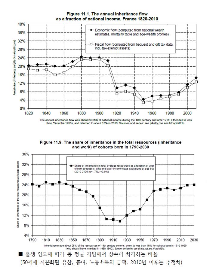 38. 유산은 해마다 받는 자원이 아니기 때문에 더욱 정확하게 추정하는 방법은 19세기 이후 역대 세대들의 관점에서 상황을 검토하고 이들이 평생 이용한 총 자원과 비교하는 것이다.(도표 11.9) 시기별로 연간 상속액 자료와 사망자, 상속인, 증여자, 수증자의 연령과 관련된 상세한 데이터를 사용해 출생연도를 함수로 삼아 이용할 수 있었던 총자원에서 상속자산이 차지하는 비율을 계산했다. 가용 자원에는 상속자산과 각 연도의 평균 순자본수익률을 적용해 개인이 평생 동안 자본화한 세후 노동소득이 모두 포함된다.