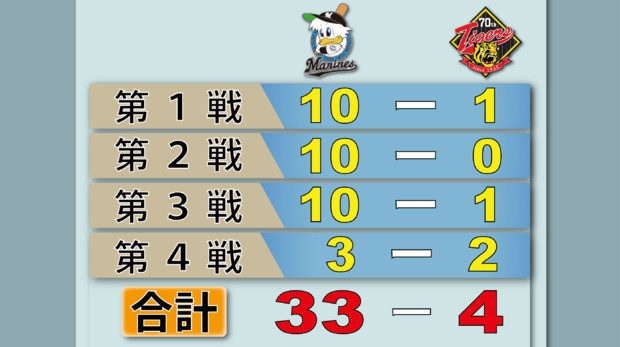 4경기를 치르는동안 롯데가 33점을 냈고 한신은 고작 4점을 내는데 그쳤다.