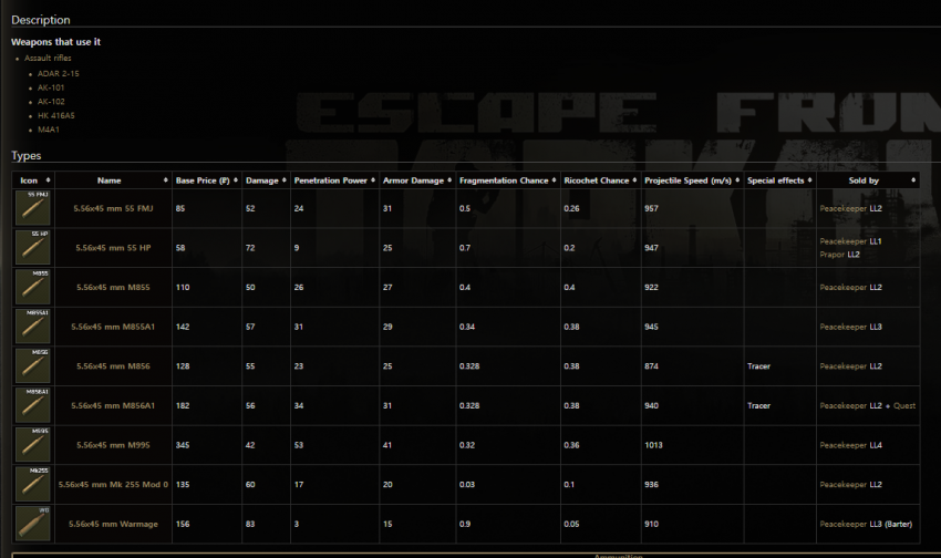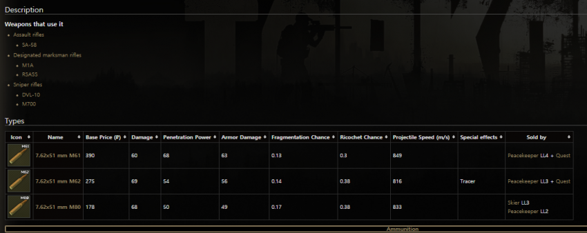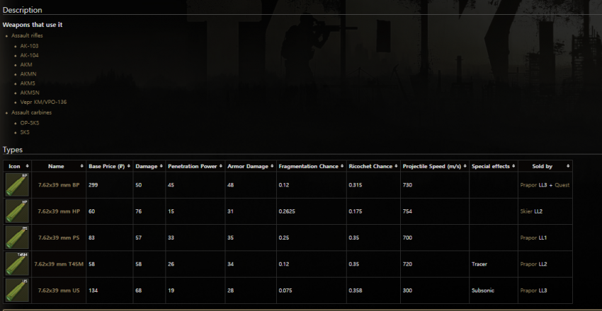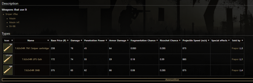 보다시피 데미지는 HP탄이 높지만 실질적인 최강 탄종은 관통력이 높은 7N39 이골닉 탄이라고 볼 수 있다. 이골닉은 초반에 얻기 힘드니 초중반에는 BS탄환을 열심히 모으도록 하자.