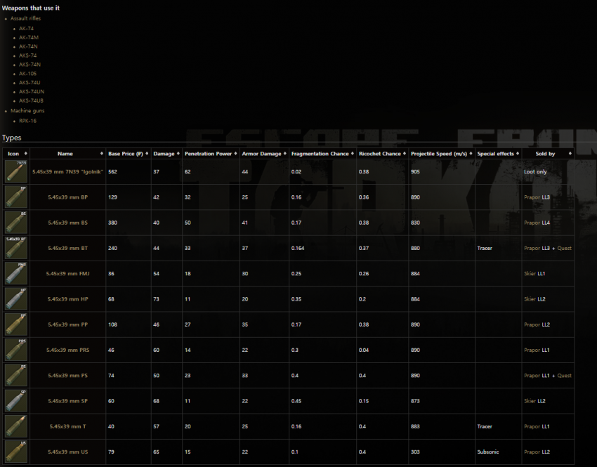 인게임에서 가장 많이 쓰이는게 5.45mm인데 무기부터 대부분이 AK74계열이고 가장 흔한 탄종이여서 그렇다. 보통 PS탄 구하기가 쉬울 거다.