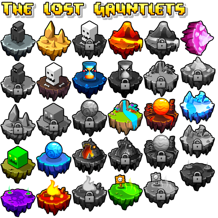 불 건틀렛, 용암 건틀렛, 독 건틀렛, 그림자 건틀렛, 보너스 건틀렛, 혼돈 건틀렛, 악마 건틀렛 빼고 나머지는 아직 공개되지 않았다.