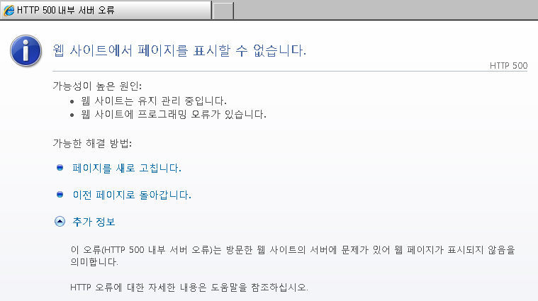 | 주의! 이 문서는 HTTP ERROR 500과 관한 것에 대해 다루고 있습니다. 지나친 ERROR은 짜증유발이 되니 휴식을 합시다. 어? 씨발 왜 HTTP ERROR 500이 떠요?? |