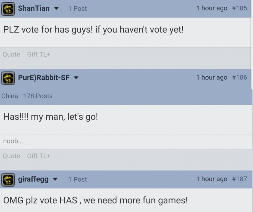 그대월 인기투표에서 Mana를 상대로 더러운 부커짓에 휘말려 잠시 밀리셨으나 Has를 추종하는 이들이 모든 화력을 모아주자 대세가 역전되었다. 3일도 못버티는 Mana의 조루화력이란...