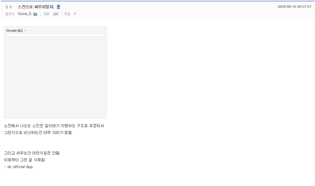 그리고 문제의 그 스킨은 수영복이랍시고 해녀복(검열된 해녀복이 아니라 진짜로 잠수복)을 내놔서 충분히 불만이 나올 수 있고, 또 불만이 없는 사람들은 쉴드를 치느라 갑론을박 할 수 있는 상황이었다. 그런데 불만을 표시하지 말라는 것이다. 물론 저 계엄령은 호평도 하지말라는 의미이긴 한데 아무튼 입을 재봉하는 거 자체가 문제다. 대체 입을 재봉해서 무슨 공리를 얻는가? 저거에 대해서 왈가왈부좀 한다고 갤이 뒤집어지거나 알바한테 차단을 먹는가? 아니면 공략글이 안올라오는가? 그냥 자기가 갤떡이 저걸로 도는 상황을 보기가 싫으니 하지말라는거다. 어허! 어르신들 계시는데! 하는 꼰대의 마인드와 다를 바 없다. 엄연한 완장 남용에 속한다.
