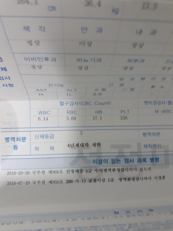 • 신체검사 정신과의 특징을 알려주자면 정신증에 준하는 사회부적응 현상을 보이는 신경증 = 최소한의 증상이라도 보인 정신증 = 5급. 신경증하고 정신증이 뭔지 모르겠으면 인터넷 검색하던지 해라.