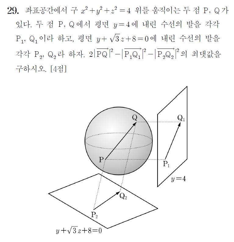 좌표공간에서 구 x2 + y2 + z2 = 4 위를 움직이는 두 점 P, Q가 있다.