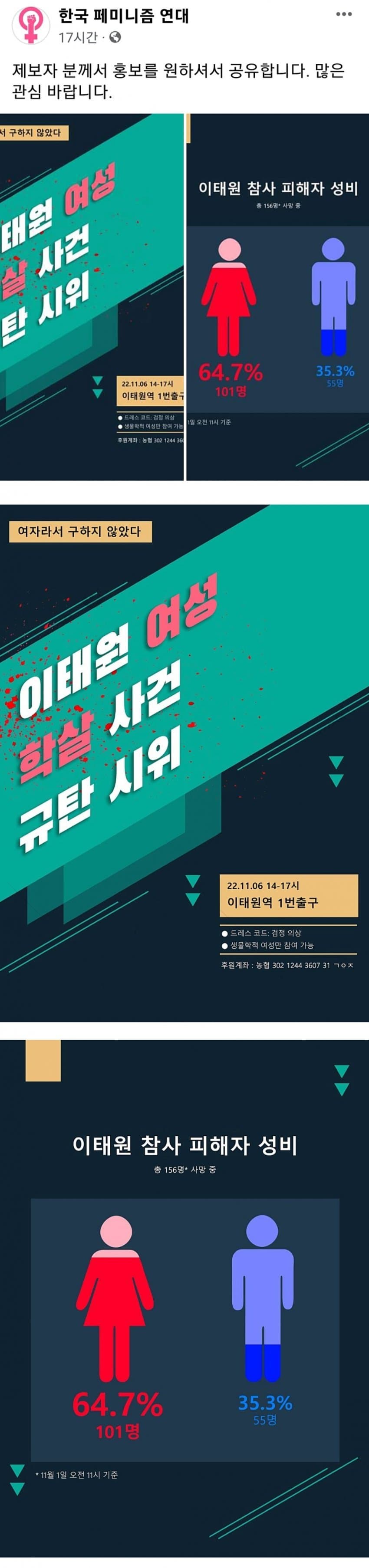 상대적으로 여성 피해자가 많은데, 여성의 근력으로는 넘어지는 인파를 버티지 못하는 것도 있고, 핼러윈 특성상 힐을 신은 사람이 많았을 것으로 추정되기 때문에 그 상황에서 여성이 인파를 버티기에는 힘들다.
